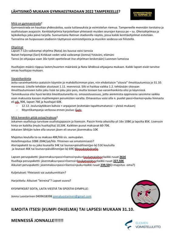 Oheisessa liitteessä lisää tietoa Pyhtään Naisvoimistelijoiden osallistumisesta tapahtumaan, hinnoista ja varainkeruusta. Sitovat ilmoittautumiset seuramme Gympille, Jonna Luostariselle tammikuun 2022 aikana. Kysy rohkeasti lisää, jos jokin mietityttää!