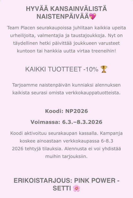 HYVÄÄ KANSAINVÄLISTÄ NAISTENPÄIVÄÄ? Team Placen seurakaupoissa juhlitaan kaikkia upeita urheilijoita, valmentajia ja taustajoukkoja. Nyt on hyvä hetki hankkia seuravaatteita edullisemmin. KAIKKI TUOTTEET -10% ?