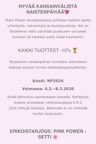 Team place tarjoaa naistenpäivän kunniaksi alennuksen kaikista seurasi omista verkkokauppatuotteista. Koodi: NP2026 Voimassa: 6.3.–8.3.2026 Koodi aktivoituu seurakaupan kassalla. Kampanja koskee ainoastaan verkkokaupassa 6-8.3 2026 tehtyjä tilauksia. Alennusta ei voi yhdistää muihin tarjouksiin. Pyhtään Naisvoimistelijoiden Team Place -seurakauppaan täältä: https://www.teamplace.eu/pyhtaannv/ |
