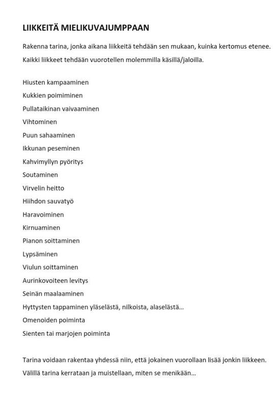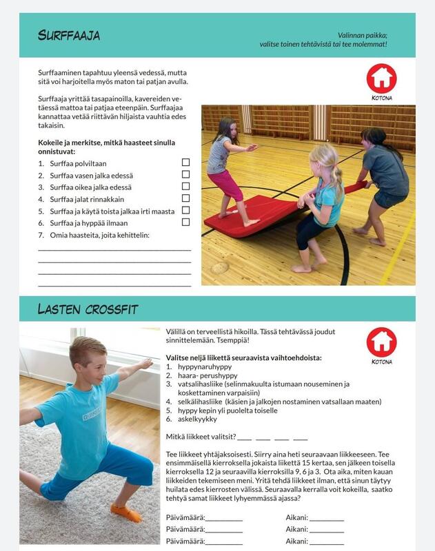 Lapsille ja nuorille: Noppajumppa (erillisinä liitteinä tässä julkaisussa) Minitanssi https://youtu.be/Cq3LOsgKYIs Lihasvoimatreeni koululaisille oman kehon painolla https://youtu.be/cRm4GRFBnYw Tasapainoillua surffaajana sisarusten tai vanhempien kanssa ja lasten crossfit (kuvana tämän julkaisun liitteenä) Mielikuvajumppaa sisarusten ja/tai vanhempien kanssa (kuvana liitteenä) Voimistelukoulu, venyttelyä ja akrobatiaa (älä yritä liian vaieita temppuja yksin, ota aikuinen mukaan, ja muista venytyksissä, että olemme yksilöinä erilaisia, älä venytä yli rajojesi) https://youtu.be/brOcMc6APzw Aikuisille: Seniorijumppaa https://youtu.be/2HHFjquWri4 Kuminauhajumppaa Kuminauhajumppa ylävartalolle. Ohjaajana Noora Oittinen, Suomen Voimisteluliitto. Haastava core-treeni Vauhdikas kehonpainotreeni Koko kehoa ja hengitystä vahvistava pilates Selkäliiton jumpalla liikkuvuutta ja vahvuutta lonkkiin (lonkkajumppa tämän julkaisun liitteenä) Kuntotanssia Booty-treeni